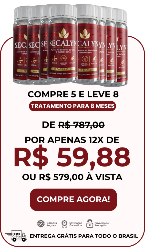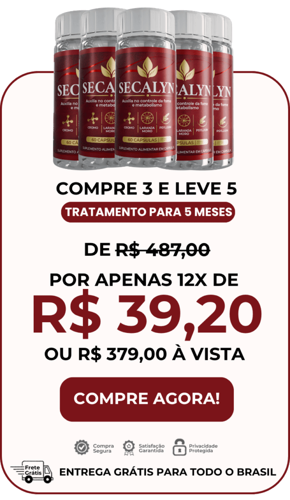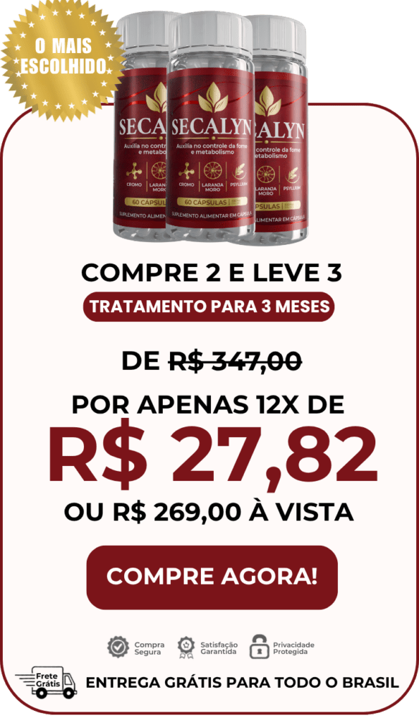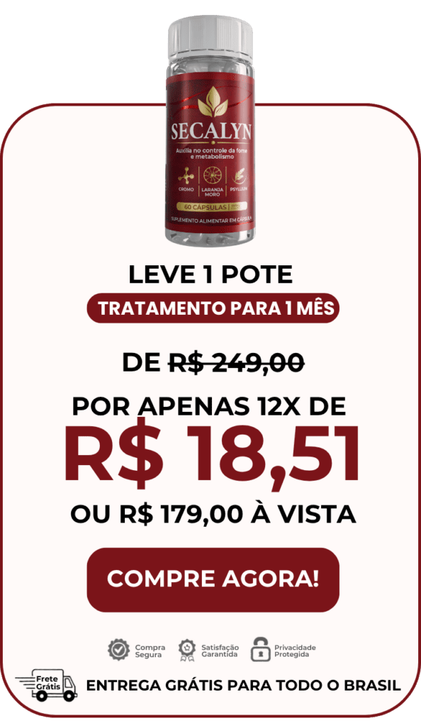 O Secalyn reúne ativos concentrados na dosagem exata para criar um autêntico “Efeito Seca” no seu corpo: ele inibe a fome emocional, reduz a absorção de gorduras e obriga o seu metabolismo a queimar os estoques mais teimosos.